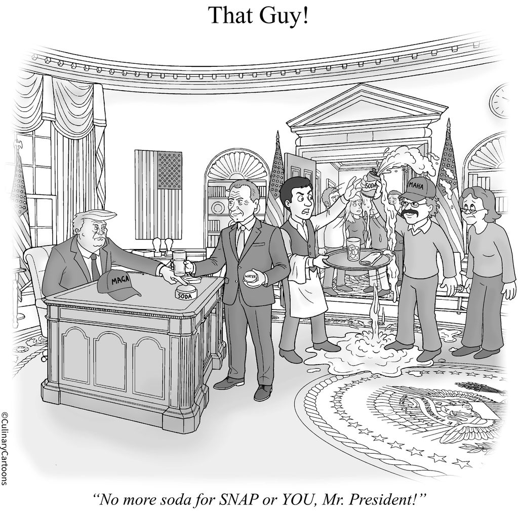 That Guy and Deary are touring The White House when he sees a soda headed to The Oval Office. To save Trump and support MAHA he grabs the soda, spilling it all over the floor. Meanwhile Trump is pushing the soda button again. And RFK, Jr. tries to bring him water and a water button.