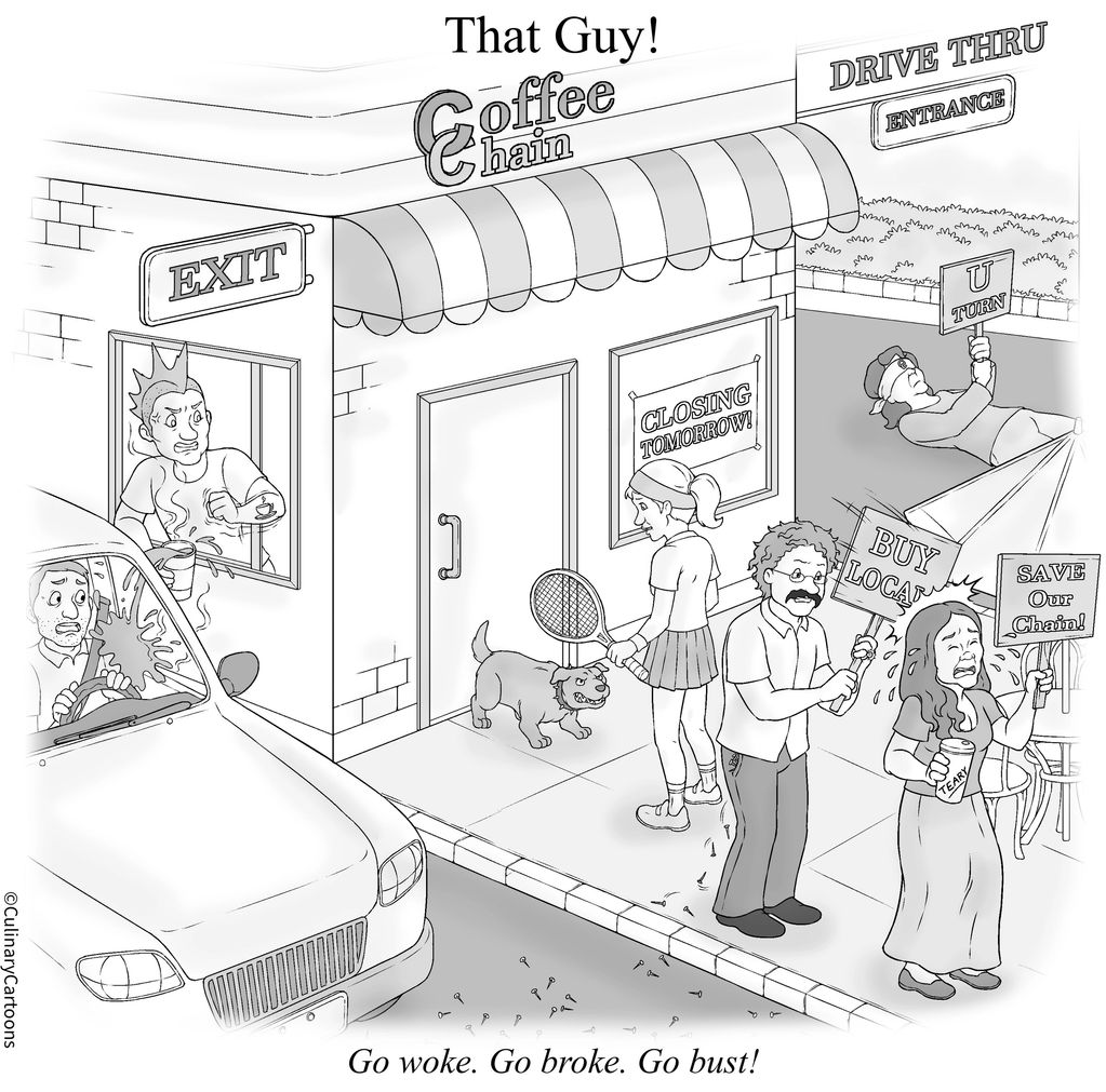 That Guy is glad to see the corporate coffee house go! He does not like their tarry tasting rocket fuel. He, Dearie, and Hooligan a counter picket to Teary’s protest of the closing. That Guy’s neighborhood needs a local coffee shop.